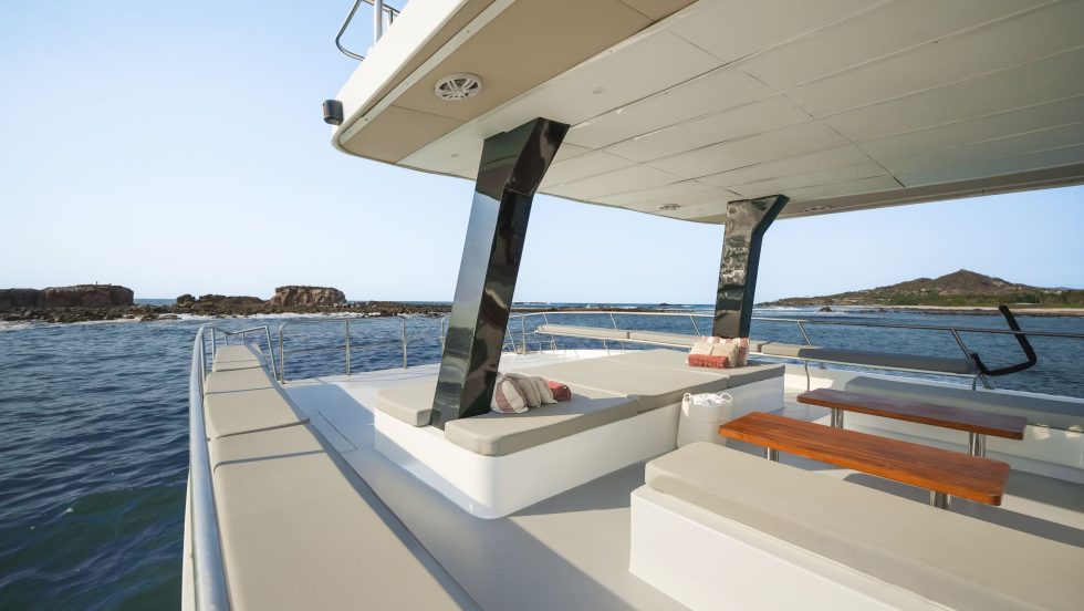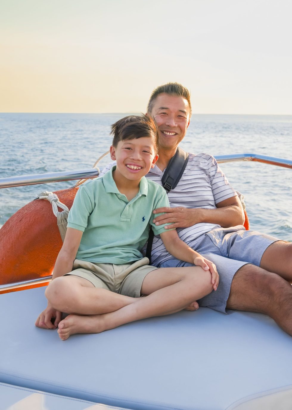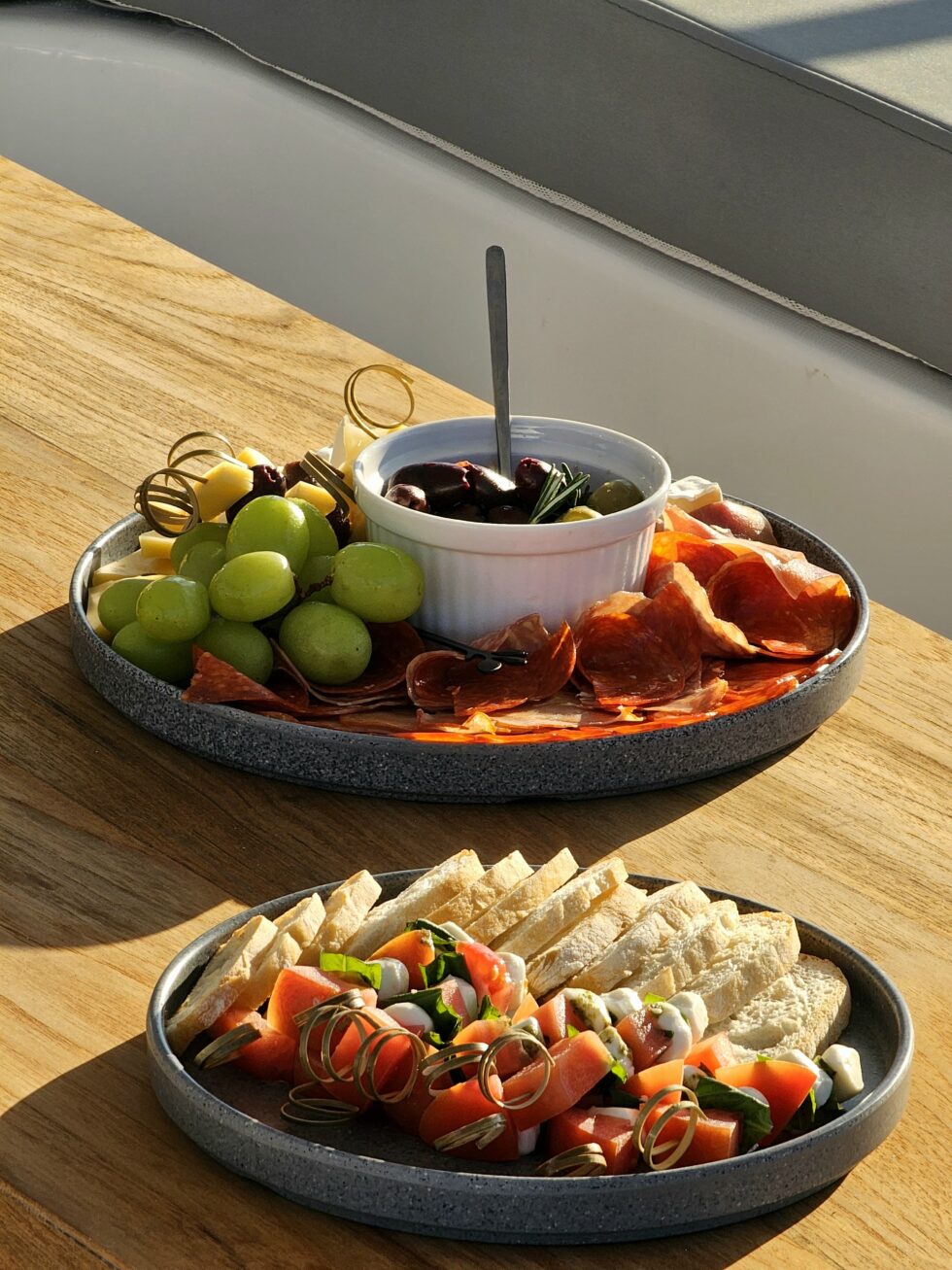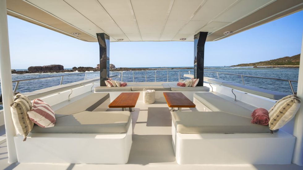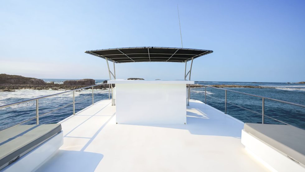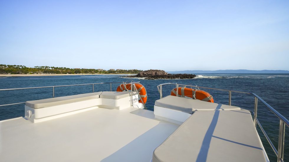 Relax in our fully shaded lounge seating areas on both the main deck and flybridge. For those who love the sun, our open sky deck awaits, complete with a private bar serving refreshing drinks as you soak in the stunning views.